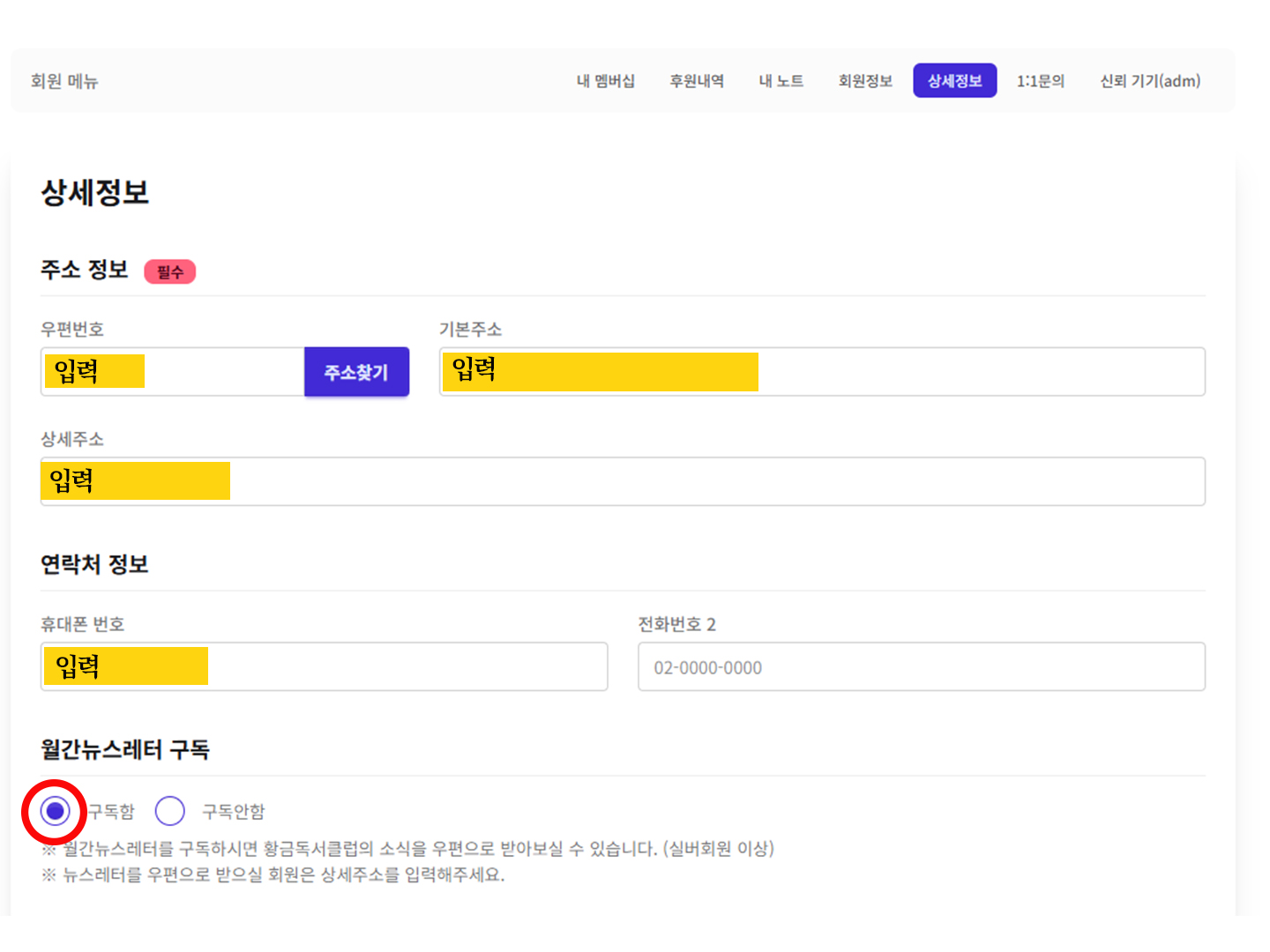 상단 메뉴에서 <내 멤버십> ☛ <상세정보> ☛ <주소 정보>를 입력해주시고,